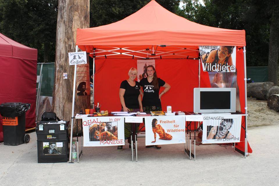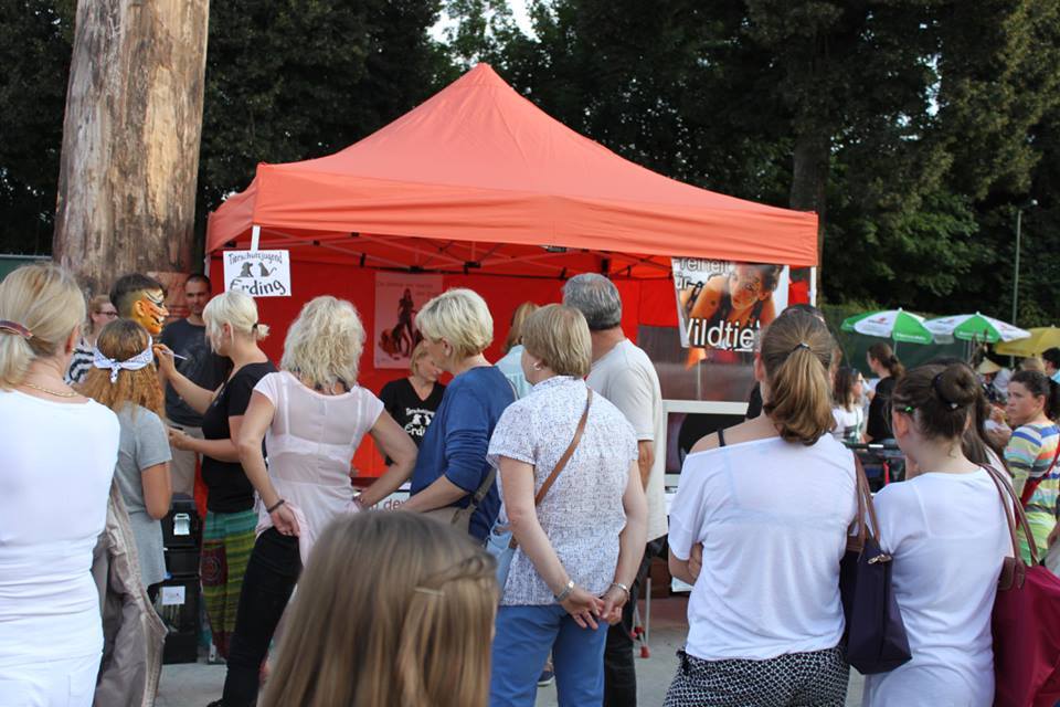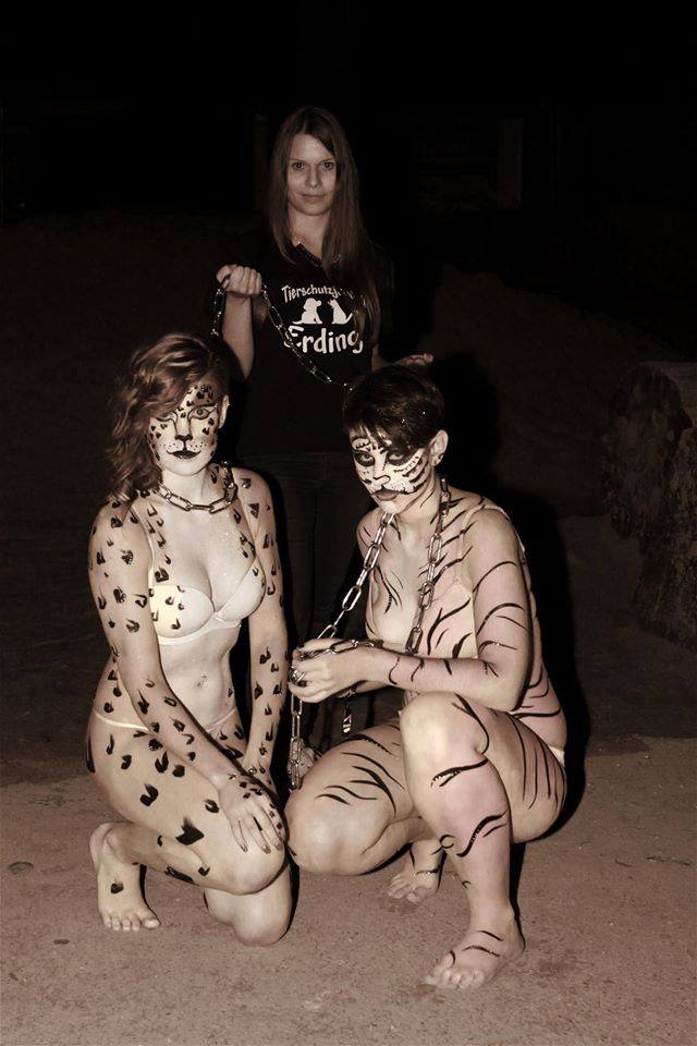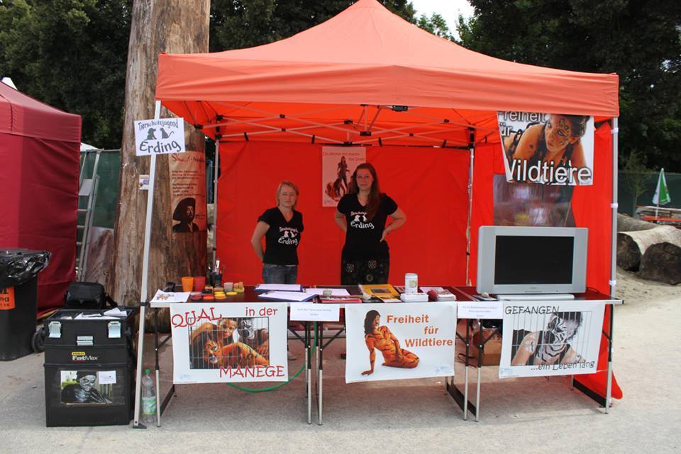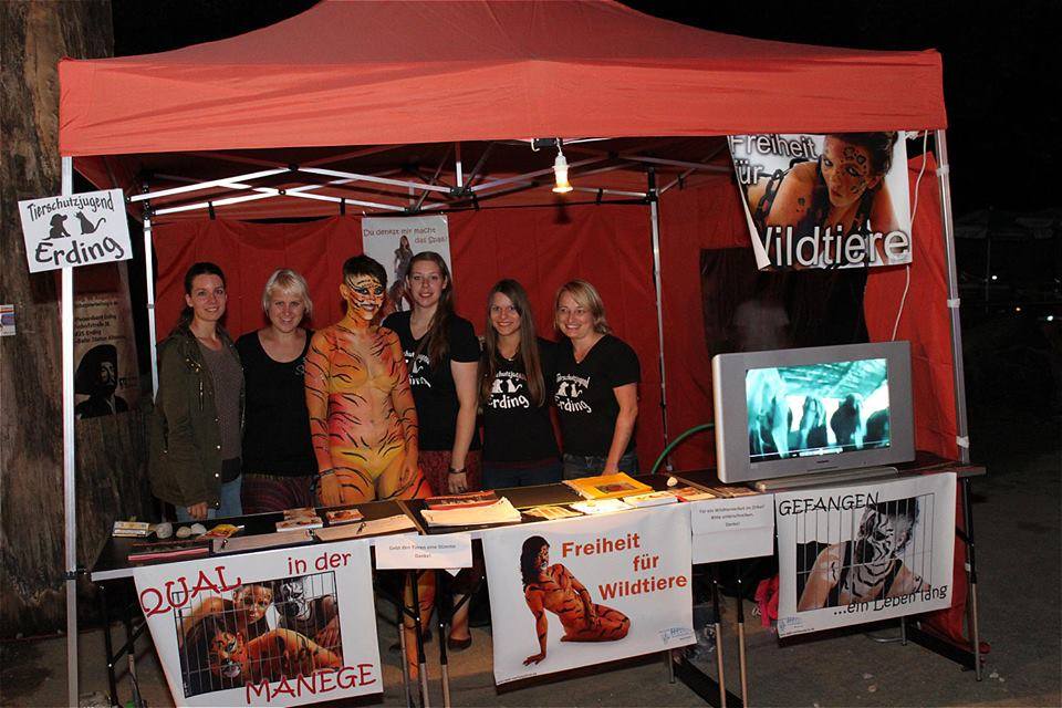 Angelehnt an die Peta-Kampagne „Tyke 2014“ setzte sich die Tierschutzjugend Erding am 31.07.2014 von 16:00 – 23:00 Uhr auf dem Erdinger Sinnflut für ein bundesweites Verbot von Wildtieren im Zirkus ein. Am Stand gab es verschiedenes Infomaterial, welches von den Passanten gut angenommen wurde und zu Gesprächen inspirierte. Weiteres Highlight war eine Dauervorführung eines Kurzfilms über die Elefantendame Tyke, die vor 20 Jahren im Zirkus Amok lief, mehrere Menschen verletzte und tötete und schließlich selbst mit 86 Schuss regelrecht hingerichtet wurde. Viele Passanten haben angehalten und wurden zum hinschauen verleitet. Zudem konnten wir viele informative Gespräche führen, zum Nachdenken anregen und ganze 439 Unterschriften für ein Verbot von Wildtieren im Zirkus sammeln – ein wahrer Erfolg! Unterstützt wurde die Aktion von unserer Bodypainterin Simone Stachl, die die Models in Wildtiere verwandelte und den Stand zu einem regelrechten Publikumsmagneten machte. Bis in den späten Abend sammelten unsere gepainteten Models im Tiger- und Leopardenlook am Sinnflutgelände Unterschriften und machten auf die Thematik und unseren Stand aufmerksam. Alles in Allem eine sehr gute Aktion, die wir auf jeden Fall wiederholen möchten. Wer die ergreifende Geschichte von Tyke noch nicht kennt, kann dies unter www.tyke2014.de nachholen. Bedanken möchten wir uns beim Sinnflut Team und der Stadt Erding, die Zirkussen mit Wildtieren aus gutem Grund bereits keine Spielmöglichkeit mehr bietet. |